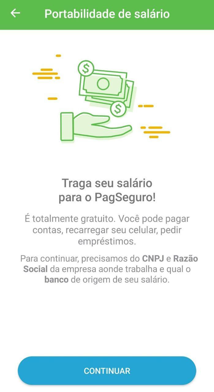 No aplicativo clique em Portabilidade de Salário nessa tela você verá uma pequena introdução sobre o serviço de portabilidade de salário do PagSeguro, aí basta clicar em continuar e informar o CNPJ e Razão Social da Empresa no qual trabalha e o nome do banco de origem no qual o seu salário é pago.